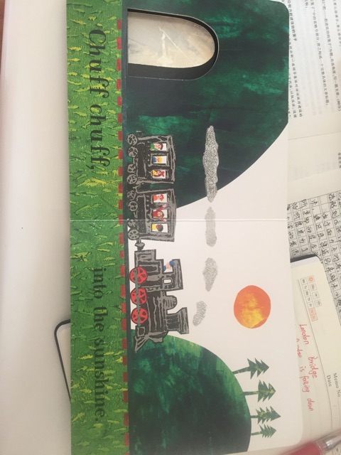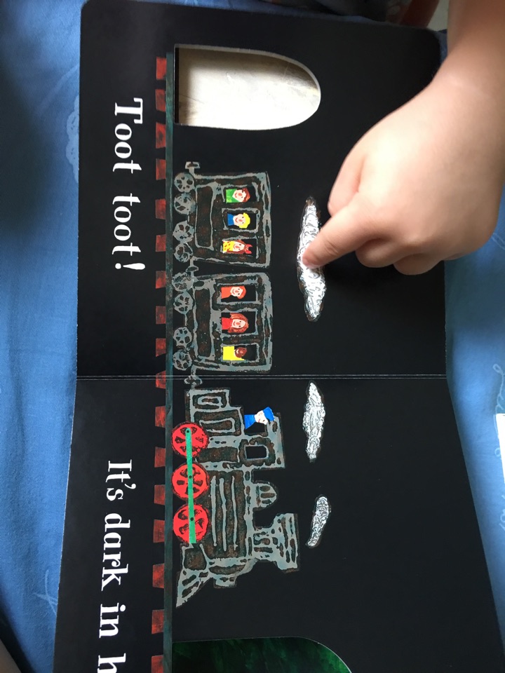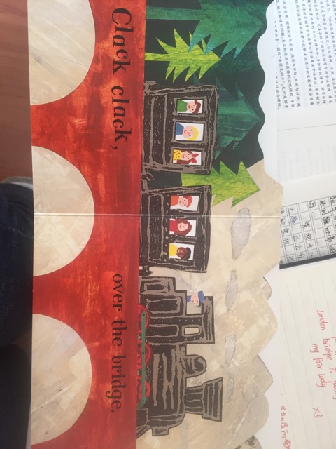 让孩子感受火车经过山林、大桥、隧道的不同声音,最后到达目的地后欢呼hooray,孩子学会后每次示范都兴奋不已。