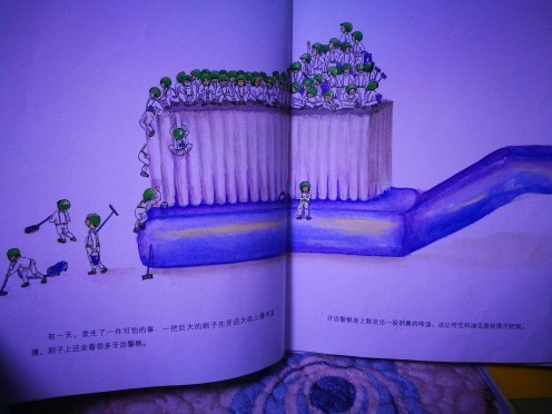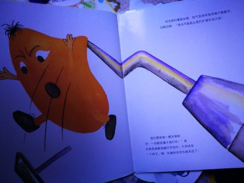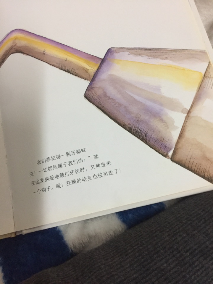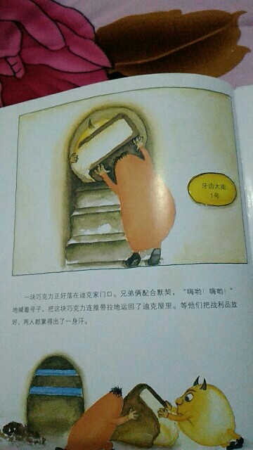 哈克和迪克兄弟俩的梦想就是修建一条龋齿大街,他们在家里修建了可可可乐的管道,贮存了各种糖果和巧克力,准备大干一番。可突然有一天,来了很多牙齿警察,他们彻底打扫了牙齿大街,带走了兄弟俩绝大部分食物。后来一束亮光和钩子还把兄弟俩和他们的家具也带走了。牙齿大街恢复了平静。之前麦穗刷牙总是不情不愿的很费劲,自从看了这本书和《阶梯数学》中的牙斑菌大灰狼,刷牙的过程顺利多了。稍有不愿,只要一问她:你要哈克和迪克来敲你的牙齿吗?马上就happy地刷牙了😬