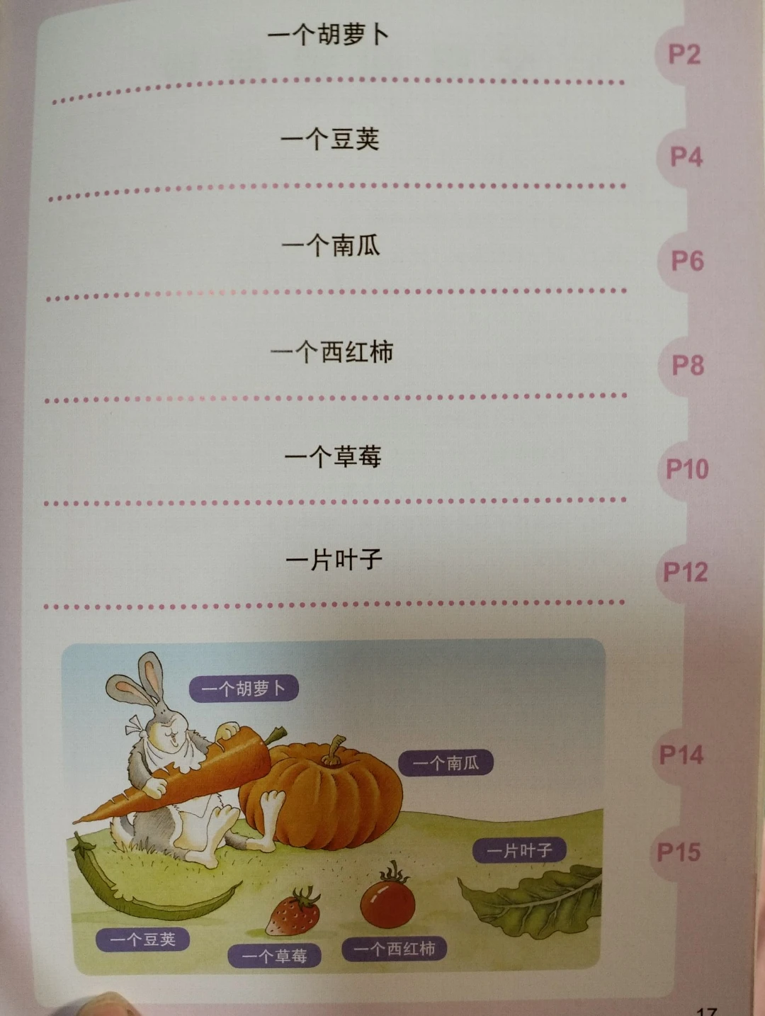 这里的英文是 "A Garden",对应的中文翻译是 《一个花园》(也可以根据绘本风格意译为《小花园》)。 这里的英文是 "A carrot.",对应的中文翻译是 “一根胡萝卜。 这里的英文是 "A bean.",对应的中文翻译是 “一颗豆角。 这里的英文是 "A pumpkin.",对应的中文翻译是 “一个南瓜。 这里的英文是 "A tomato.",对应的中文翻译是 “一个西红柿。 这里的英文是 "A strawberry.",对应的中文翻译是 “一颗草莓。 这里的英文是...