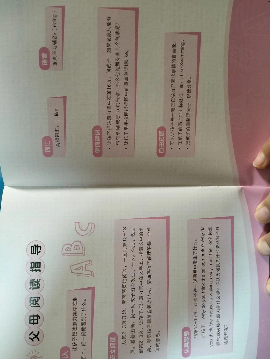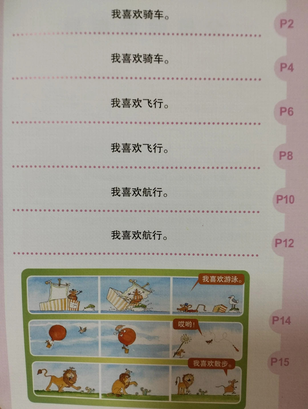 这页通过“sailing(航行)”拓展了新的活动类词汇,搭配热气球航行的画面,能帮孩子直观理解这个动作~提取的英文:I like sailing. 翻译:我喜欢航行。 1. I like swimming. 翻译:我喜欢游泳。 2. Oops! 翻译:哎呀!(表示意外、失误的感叹词) 3....