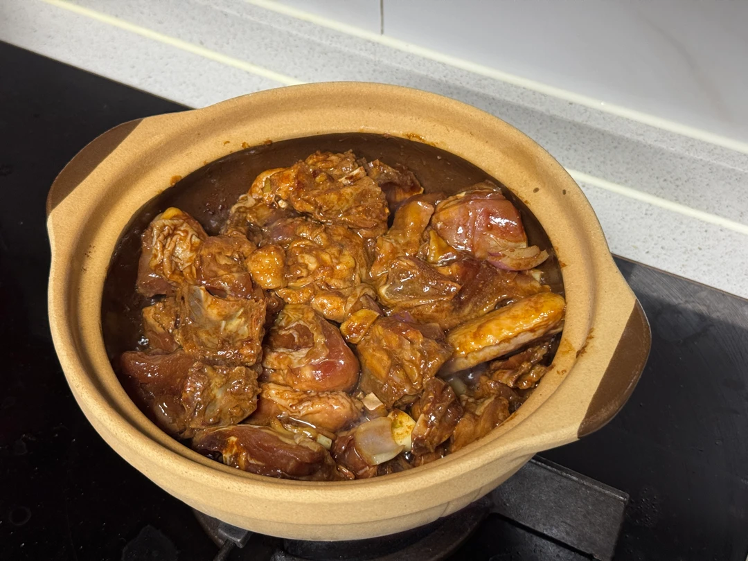 (4)再倒入调好的料汁,盖上锅盖,大火焖至汤汁浓稠,食材熟透入味。