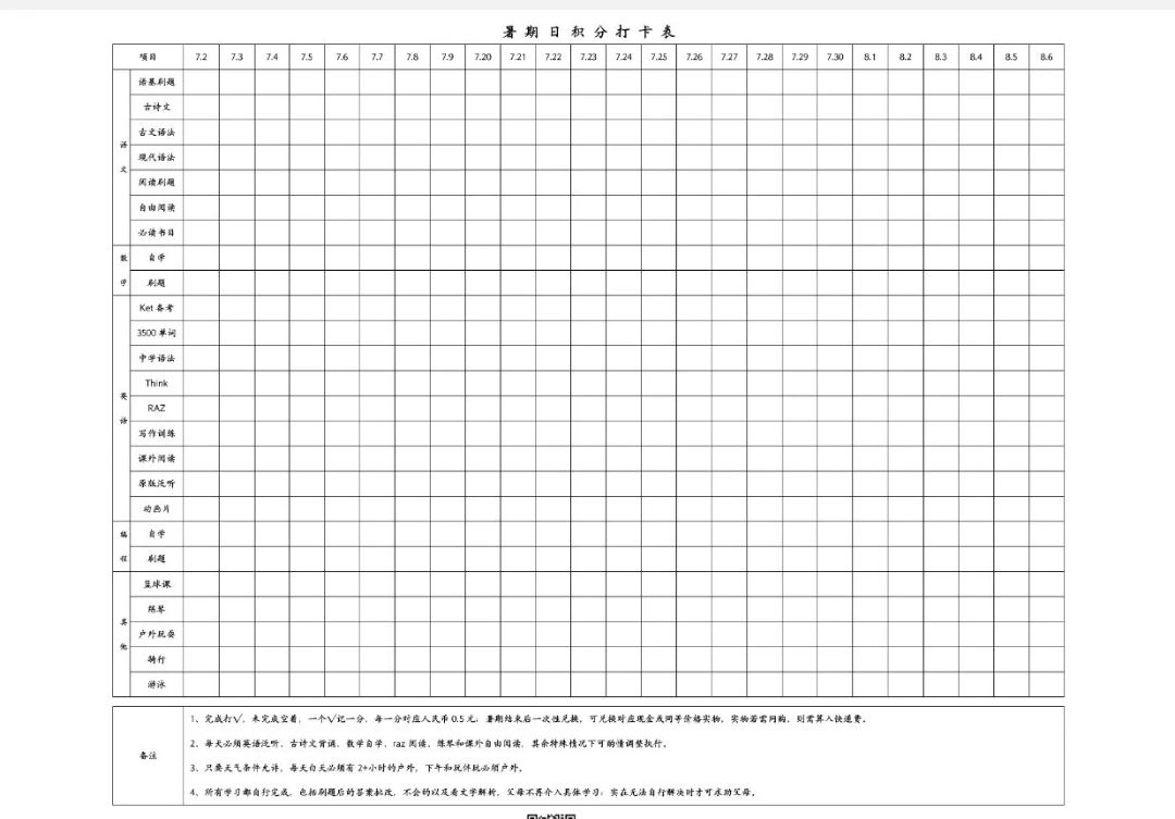 整个计划与暑假日打卡积分表配套使用,每项安排尽可能完成。其中每天的数学、古诗文背诵、raz阅读、编程备赛必须完成,其他所有在特殊情况下可酌情执行。