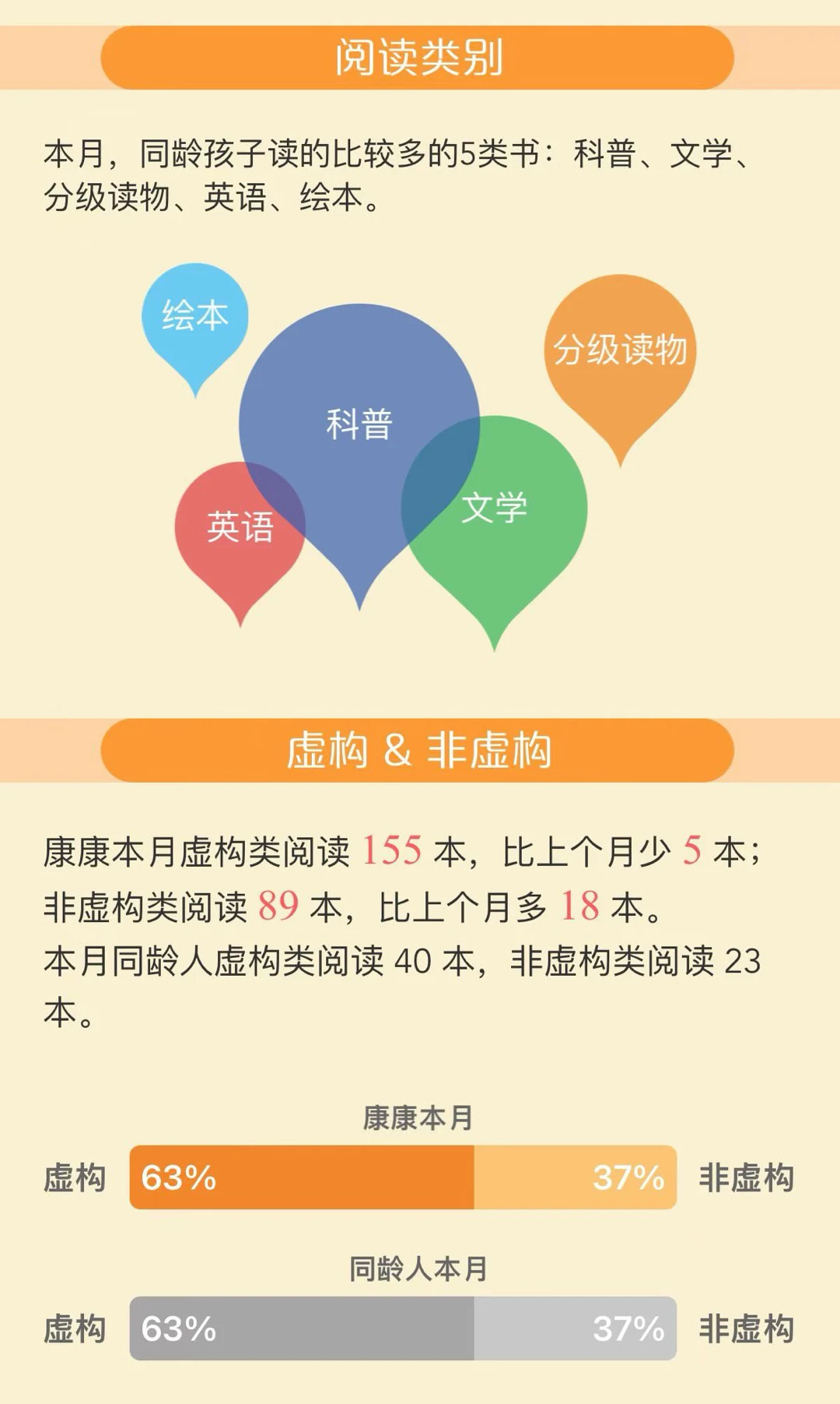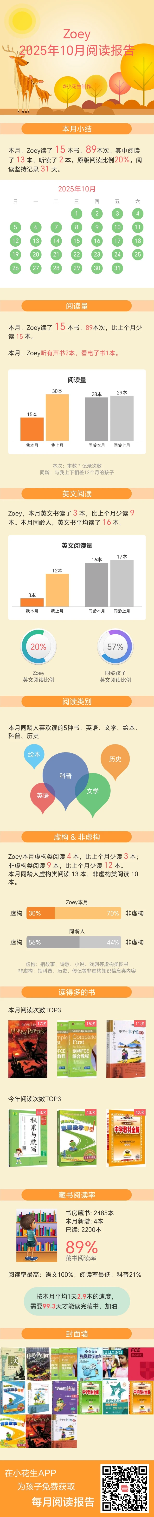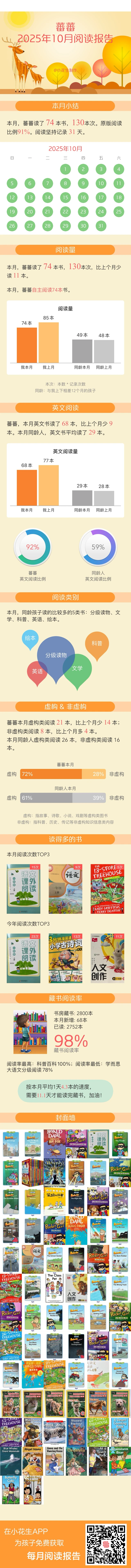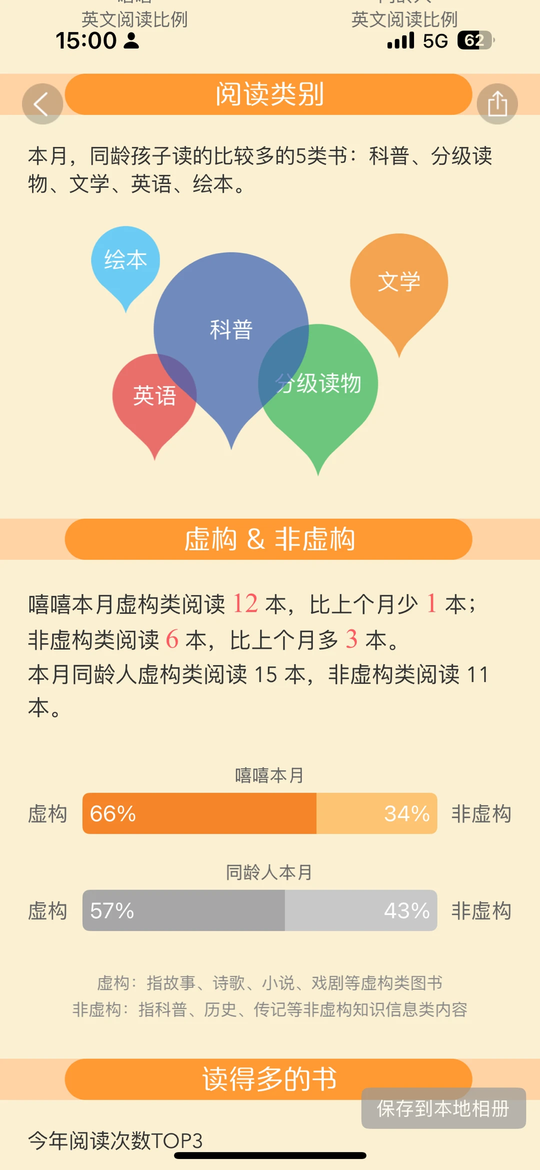 非虚构书籍阅读比例呈碾压式(70%),无论中英文,娃都更喜欢非虚构。