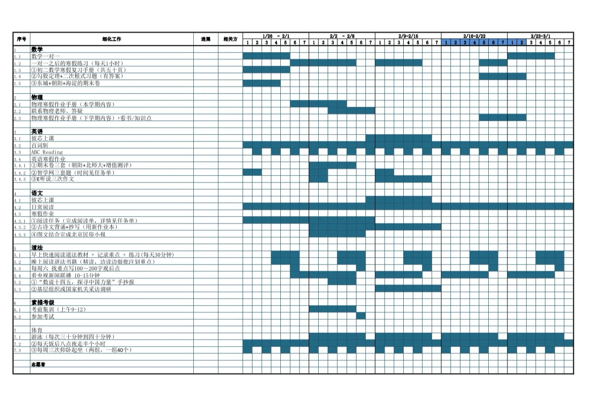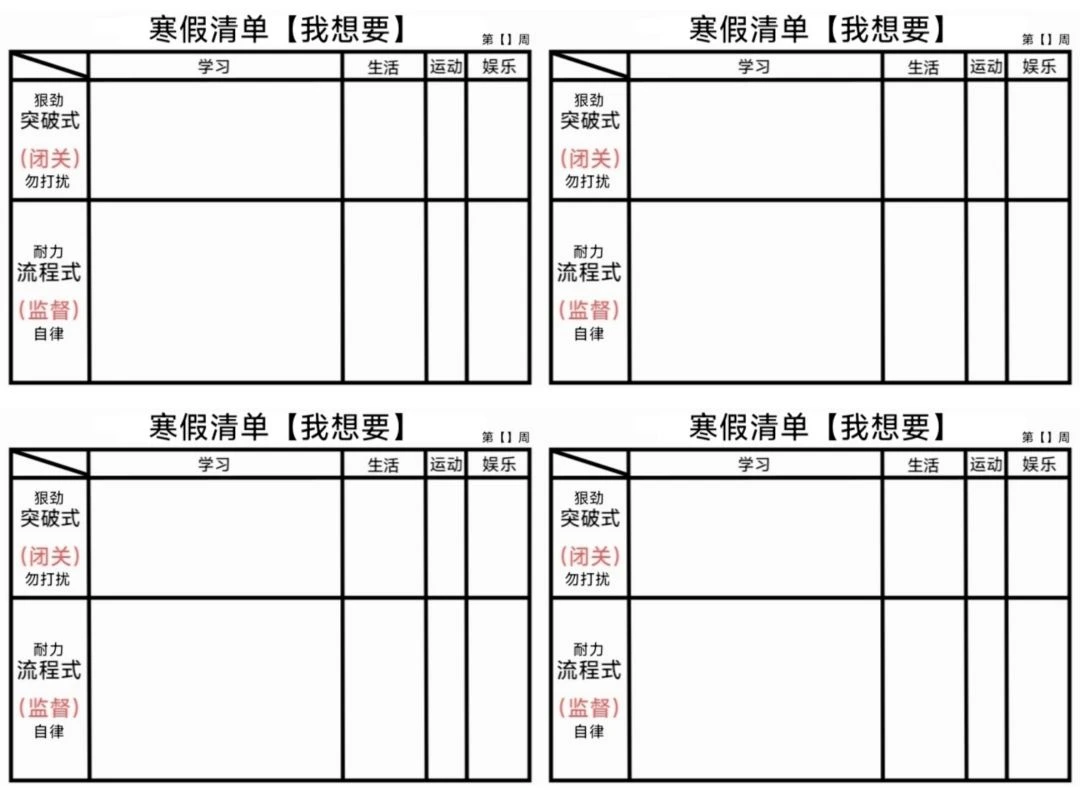 寒假计划要有明确的目标,目标比具体计划重要得多!计划很难每天按部就班、一五一十地执行,所以经常会变,但目标定在那里,逼着自己达成,即使计划有变,为了达成最终目的也要把没做的补回来!鸡娃目标要订得符合当前能力,最起码也是踮一踮脚尖可以够到的,这样计划就可以订的切实可行,不难完成✅