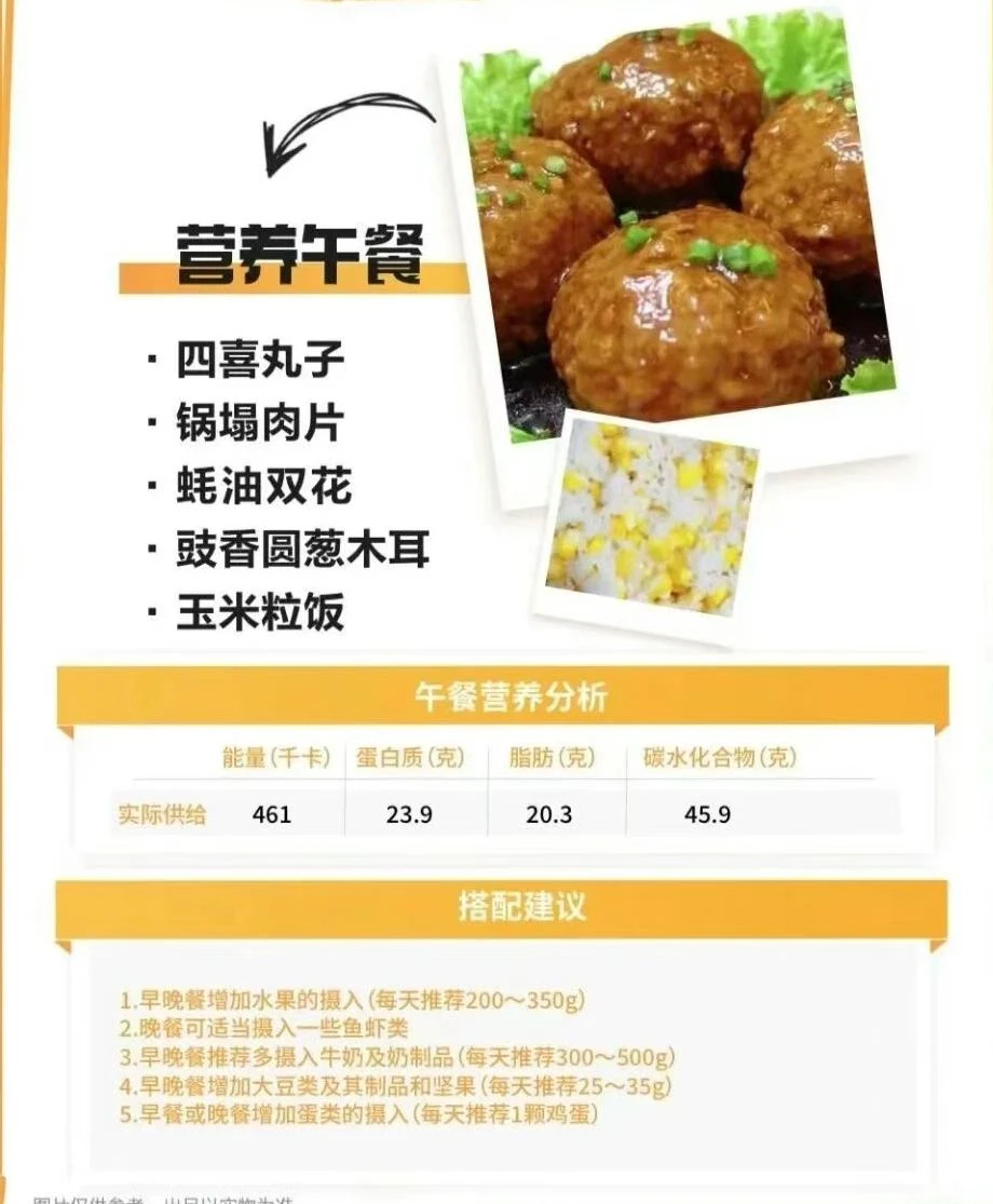 孩子的学校每周有食谱公布在学校公众号上,应该也是集体备餐的预制菜为主,学校有食堂,但作用应该是再加工一下,看食谱还是营养丰富种类多样的,孩子平时也不是爱吃的孩子,没有听他吐槽学校的餐食不好吃,除了吃包子的时候平时基本也不添饭。