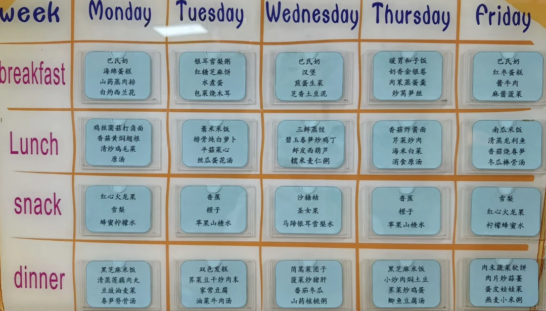 午餐:四菜一汤,两荤两素,我们会每天看一下食谱,会给孩子一些建议;不喜欢油炸食品,会让那个孩子少吃一些。