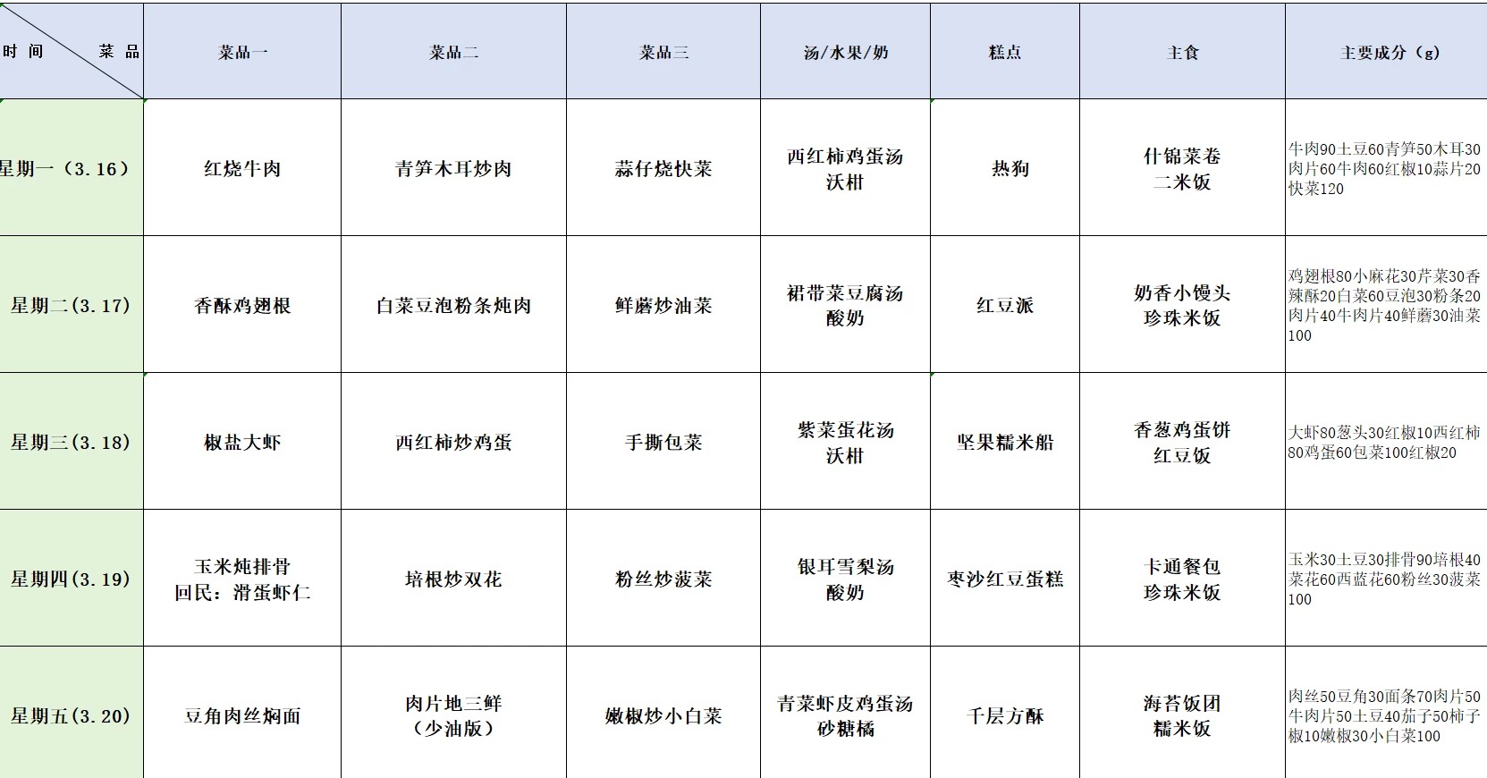 小孩哥放学回来后,我问他在学校吃的怎么样,他经常说不记得了,学校会定期推送食谱,看着菜单还可以,但是我没见过实物,小孩哥说挺好吃的,哈哈哈。我家小孩哥有点偏瘦,今年争取多户外,多运动,尽量长点肉。加油呀。