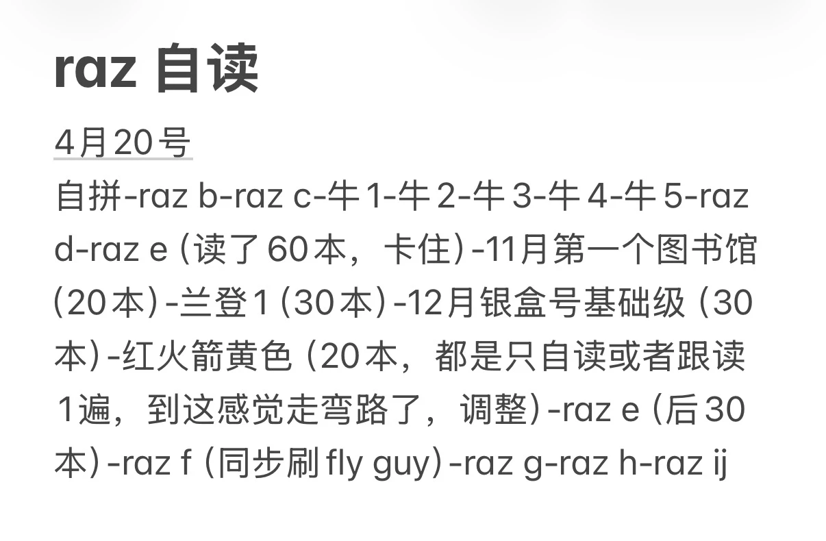 我们家情况是这样的:娃年纪小,3岁半开始自读raz,因为之前亲读完全没有指读的习惯,导致孩子一个视觉词都没有,没错一个都没有。学了部分自拼与高频词后回头自读raz,每一级都很困难。老母亲也陷入困境,每次两个人读书都很崩溃。后来研究路线,觉得还是自...